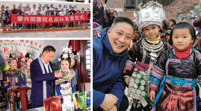圖1-3:參加肇興侗(dòng)寨高(gāo)鐵冠名儀式/張萬廣直(zhí)播帶貨的場麵/張萬廣與黎平縣的孩子們(men)合(hé)影