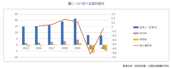 疫情前GBT收入逐年上升,受新冠疫情衝擊收(shōu)入(rù)利潤(rùn)大幅下滑,近期業(yè)績逐漸修(xiū)複。2015-2019年GBT收(shōu)入由14.88億美元增長至21.19億美元,連續兩年增速超10%,2019年總(zǒng)交易量(TTV)達到新高290億美元,較去年增長9.8%,從盈利(lì)情況看,GBT 在2017年實現扭虧為盈,淨利潤0.43億美元,2019 年淨利潤1.34億美(měi)元,淨利率由2.68%提升至6.32%。2020年受新冠疫情影響,收入下跌62.58%至7.93億元,EBITAD和淨利潤轉(zhuǎn)負,虧損6.18億美元。2021 年受收益率下降影響,總收入下降4%,雖仍未恢複盈利(lì)但較去年減虧1.43億(yì)美元。受國際旅行複蘇影響,2022年二季度GBT收入同比增長217%至(zhì)4.86億美元,恢複至2019年的64%,淨虧損縮減為200萬(wàn)美元。2022年上半年收入恢複至2019年同期的76%, 預計下半年交易業(yè)務複蘇將推動GBT收入恢複,全年交易量將恢複到2019年的74%,全年收入預期達到18.5億美元。