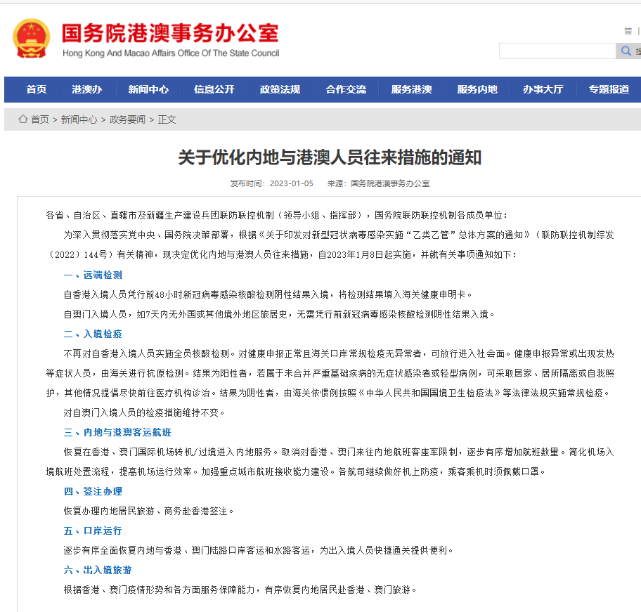 1月5日,國務院聯防聯控機製綜合組發布《關於優化內地與港澳人員往來措施的通知》,自香(xiāng)港入境(jìng)人員憑行前48小時新冠病毒感染核酸(suān)檢測陰性(xìng)結果(guǒ)入境,將檢測結果填入海關健康申明卡。