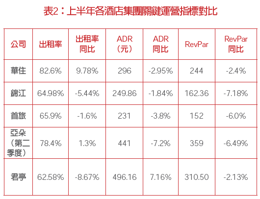 受上半年宏觀消(xiāo)費以及去年高基數影響,上半(bàn)年各大(dà)酒店集團出租(zū)率表(biǎo)現分化(huà),RevPAR、ADR則普遍出現(xiàn)下(xià)滑。上半年,受宏(hóng)觀(guān)經(jīng)濟不確(què)定以及消(xiāo)費者信心不足等(děng)因素影(yǐng)響,商旅需求方麵,差旅預算收緊,商務差旅活動更多集中在(zài)中心城市。旅遊需(xū)求方麵,消費(fèi)信心下滑,酒店行業麵臨消(xiāo)費分(fèn)級的壓力,此外,二(èr)季度開始極端天氣明顯,出行減少。從出租率來看,華住和(hé)亞朵酒店保持(chí)了正增長,分別同比增長9.78個(gè)百分點和1.3個百分點;錦江(jiāng)同比下降5.44個百分點,首(shǒu)旅則微降1.6個百分點,君亭酒(jiǔ)店(diàn)下降8.67個百分點。從平均房價和間房收益來看,亞朵和君亭(tíng)酒店作(zuò)為中高端酒店的代表,其平均房價和間房收益明顯高於華住(zhù)、錦江和首旅酒店,但從(cóng)同比來看,受整體宏觀環境及惡劣天氣影響,亞朵和君亭酒店的同比降幅也較大,其中君亭酒店旗下新安江景瀾酒店遭受的持續大雨(yǔ)和洪澇災害致使酒(jiǔ)店停業抗災長(zhǎng)達半月之久。華住集團預計今(jīn)年7、8兩月暑期數據將(jiāng)同比下降10%左右。