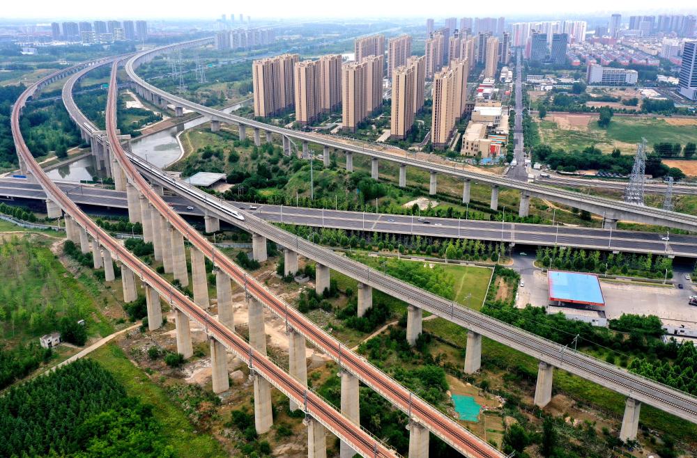 2024年5月30日,一列動車組列車行駛在鄭州東站附(fù)近的線路上。(新華社發)