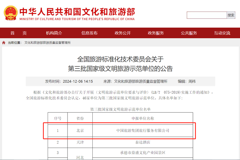 12月6日(rì),全國旅遊標準化技術委員(yuán)會發布“關於第三批國家級文明旅遊示範單位評定結果的公(gōng)告”,中旅旅行榮獲“國家級文明旅遊(yóu)示範單位”稱號,是此次北京市唯一獲此殊榮的單位。