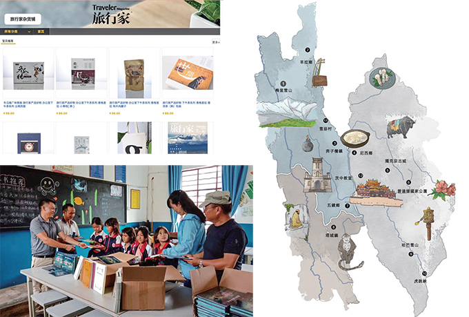 圖1-3:旅行家淘寶店扶貧產品;孩子(zǐ)們領取贈書;「時光之禮」旅遊路線