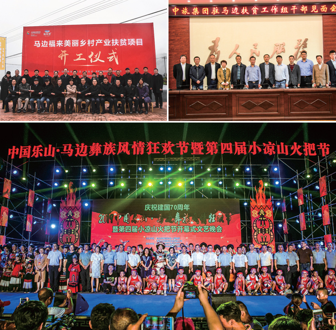 圖1-3:馬邊福來美麗鄉村項目開工儀式(shì);2018年4月,中旅(lǚ)集團(tuán)駐(zhù)馬(mǎ)邊扶貧工作組見麵會合(hé)影;集團與馬邊縣政(zhèng)府聯合主(zhǔ)辦小涼山火把節