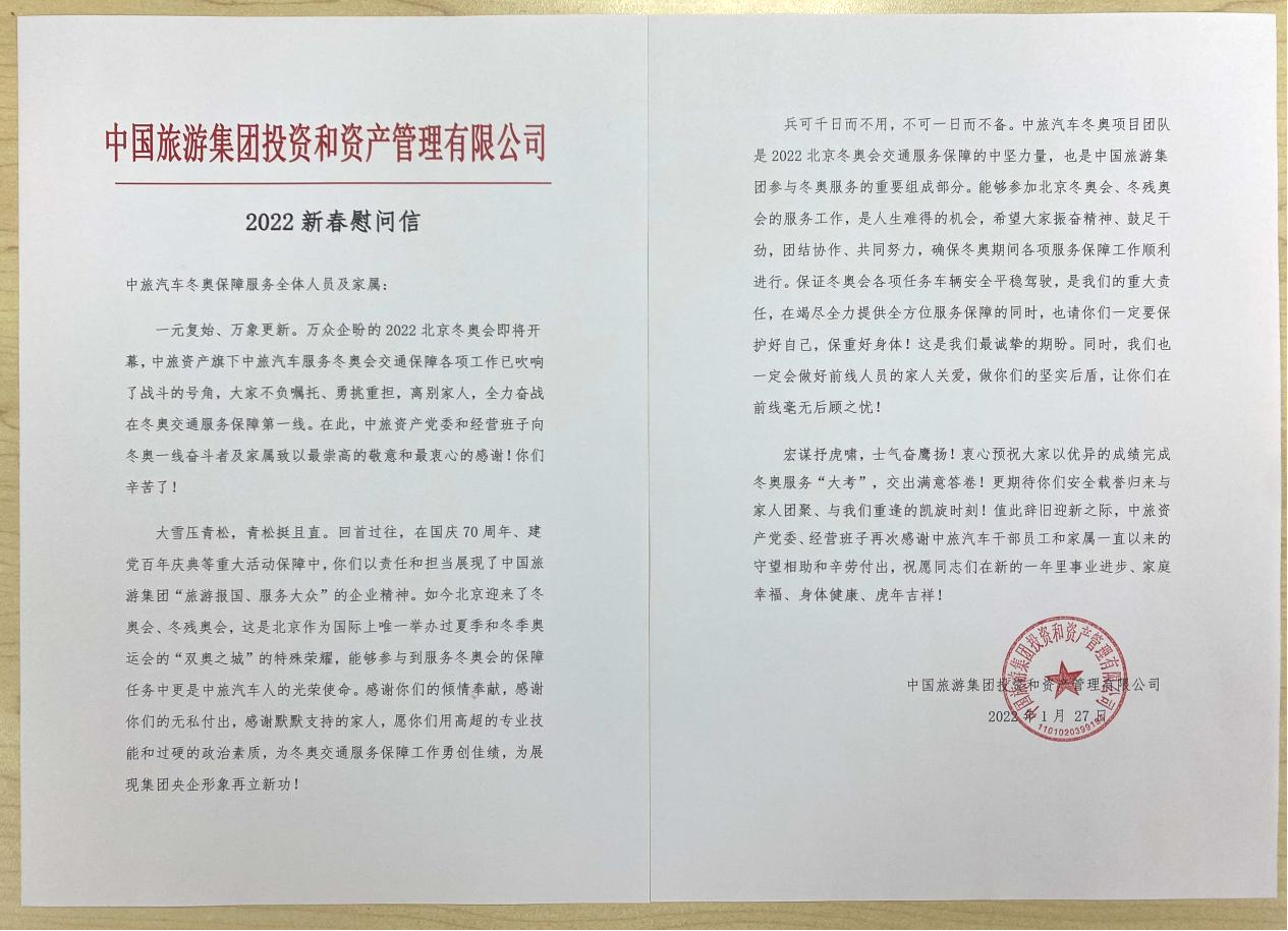 中旅資產近日向中旅(lǚ)汽車(chē)冬奧交通(tōng)服務保障全體人員及家屬發出“致冬奧奮鬥者新春(chūn)慰問信(xìn)”。