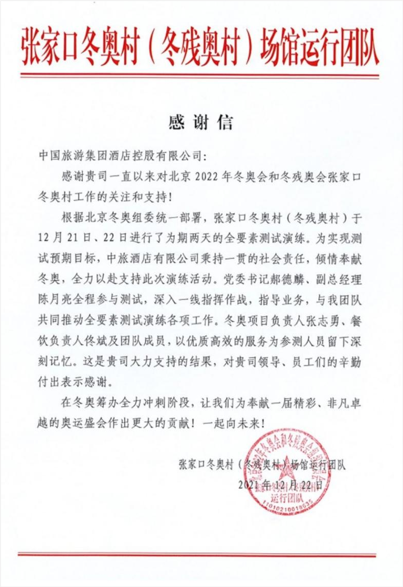 北京奧組委張家口冬奧村運行團隊先後向中旅冬奧服務團隊專致感謝信,對中旅團隊急人所急、主(zhǔ)動作為的奉獻精(jīng)神和兢兢業業、堅守崗位的(de)敬業精神提出表(biǎo)揚,以多個(gè)真人真事概(gài)括了冬奧(ào)村開村(cūn)以來的“中(zhōng)旅冬奧服務故事”,同時,信中點名表揚了多位中旅服務人員。