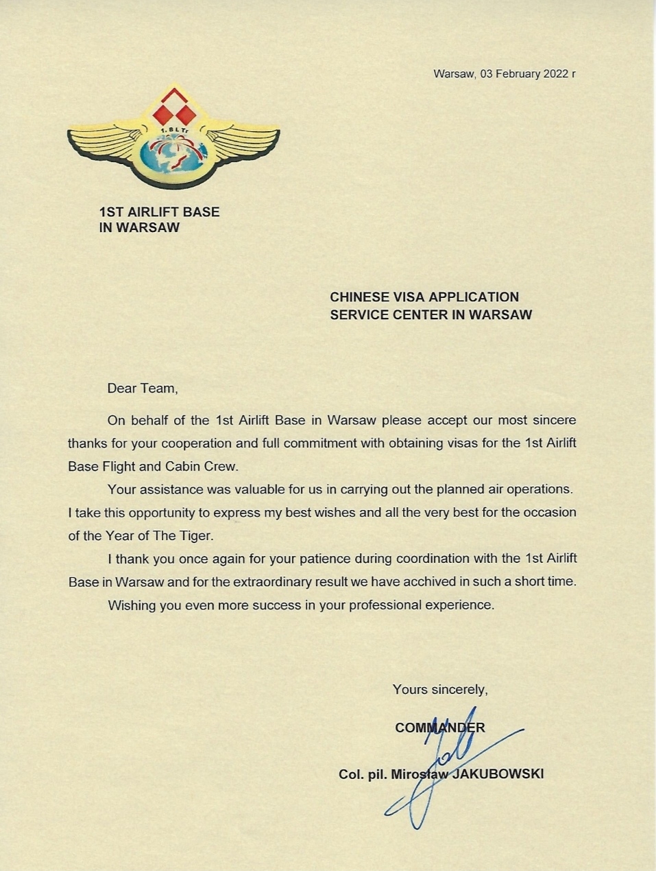 集團中旅旅行所屬境外各簽證中心為有關國家和地(dì)區參賽人員(yuán)及(jí)賽(sài)事相關人員提供專業高效的簽證申請(qǐng)服務,讓他們在踏(tà)入中國國門之前就感受到中國人民的(de)熱(rè)情友好,細致入微的服務給各國參賽人員留下了(le)深刻的(de)印象,陸續收到(dào)來自我駐外使領館、各國冬奧(ào)團組的感謝函件。其(qí)中,執飛波蘭總統杜達訪華專機的波蘭空軍一(yī)號基地總司令Miroslaw JAKUBOWSKI將軍署名的感謝(xiè)信(xìn),對華沙簽證中心為專機機組人員辦理加急簽證(zhèng)提供便利條件和熱情服務給予高度評價。
