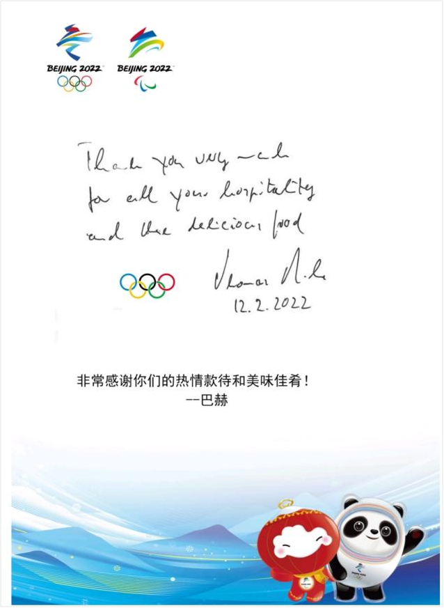 集團中旅酒(jiǔ)店高質量高標(biāo)準提供住宿餐飲服務、接待服務,全力以赴做好各項服務保(bǎo)障工作(zuò),受到國際(jì)奧委會多次讚揚。國際奧委會主席巴赫在張家口冬奧(ào)村運動員餐廳就餐後,特別(bié)留言點讚張家口冬奧村(cūn)的餐飲服務,寫道:“非常(cháng)感謝你(nǐ)們的熱情服務和美味佳肴”。國際奧委會北京冬奧會協調委員會主(zhǔ)席胡安·安東尼奧·薩馬蘭奇“微服私訪”張家口冬奧(ào)村運動員餐廳,經過手消、選餐、取餐、用餐等一係列流程的親身體驗,他對張(zhāng)家口冬奧村(cūn)的餐飲(yǐn)服務讚不絕口,並專門手(shǒu)寫感謝留言。