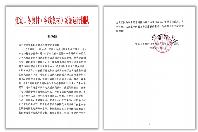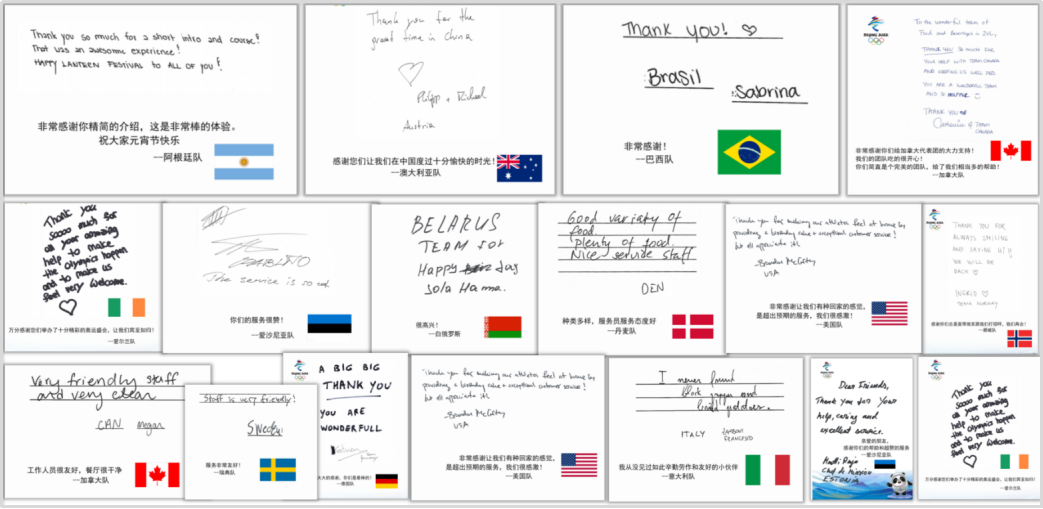 北(běi)京冬奧(ào)開村以來,中旅冬奧服務團隊陸續收到來自美國、加拿大、俄羅斯、法國、意大利、瑞典等國代表(biǎo)團的感謝信。信中對中旅團(tuán)隊提供的熱情、細致(zhì)、專(zhuān)業的服務予以肯定,並對工作人員表示(shì)衷心感謝。有關感謝信表示,“住宿和餐飲(yǐn)的感受能夠直接影響遠道而來的(de)外國(guó)友人對於冬奧會乃至對中國的整體感觀。中國人都講賓至(zhì)如歸,正是你們細致周到的服(fú)務,促進了冬奧會的順利舉辦,也讓大家感受中國的大國風(fēng)采。”來自美國(guó)代表團(tuán)的官方感謝(xiè)信信中提及,在2月9日至10日(rì)美國隊運動(dòng)員大範圍轉場這(zhè)一最複雜的過渡期,中旅服務人員(yuán)超越期待,及時完成了房間打掃和清理,讓新入村的人員感到很(hěn)受歡迎。