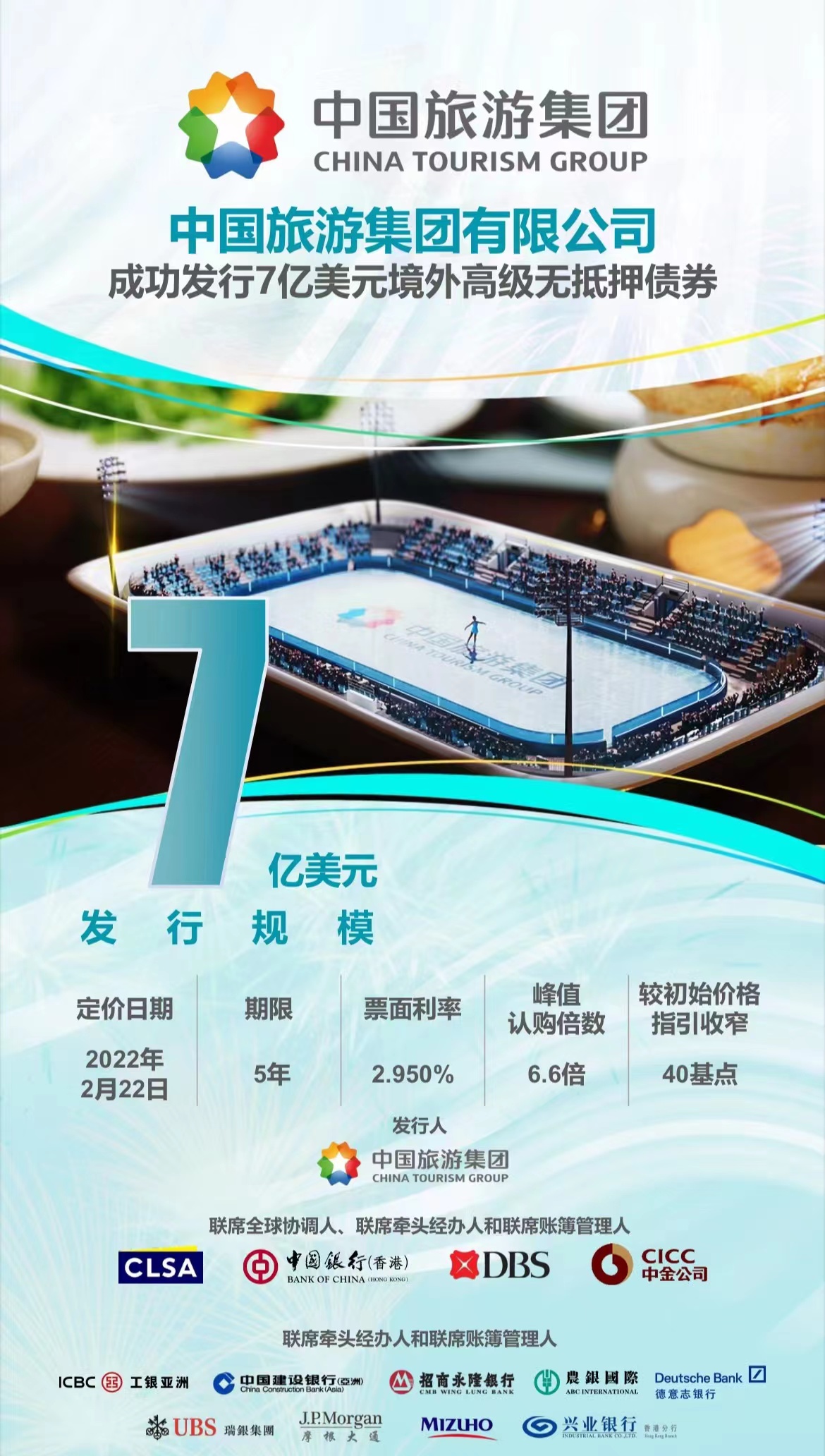 2月22日,集團成功發行(háng)境外高級無抵押債券,發行規模7億(yì)美元,期限(xiàn)5年,票麵利率2.950%。本次發行是集團時隔兩(liǎng)年重(chóng)新亮相國際資本市場(chǎng),發行規模大,價格(gé)低,市場反響熱烈,共(gòng)吸(xī)引了(le)全球148家機構投資者踴躍認購,認購倍數高達6.6倍。