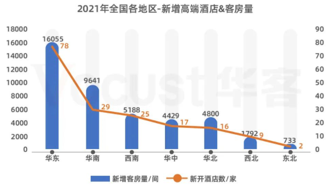 根據(jù)統(tǒng)計,2021年華東新增高端客房量和新開高端酒(jiǔ)店數均位列第一位。