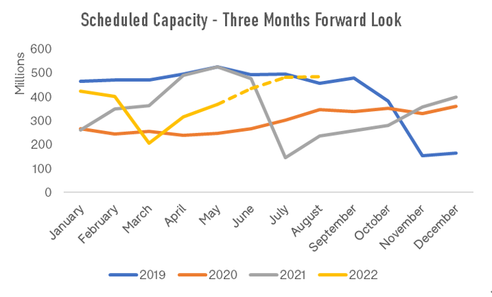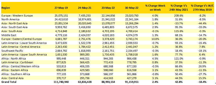本周全球航空運力再次突破9000萬個(gè)座位數(shù),達到9120萬。比上周增(zēng)加了2.4%,新增了210萬個座位,這也(yě)是疫情以來單(dān)周最高的運力值。這周運力增長明顯的地區包括歐洲(zhōu),該地區增長占據整體增量的(de)一半以上,體現該地區休閑遊需求的(de)複蘇,今年夏季需求將充分恢複。