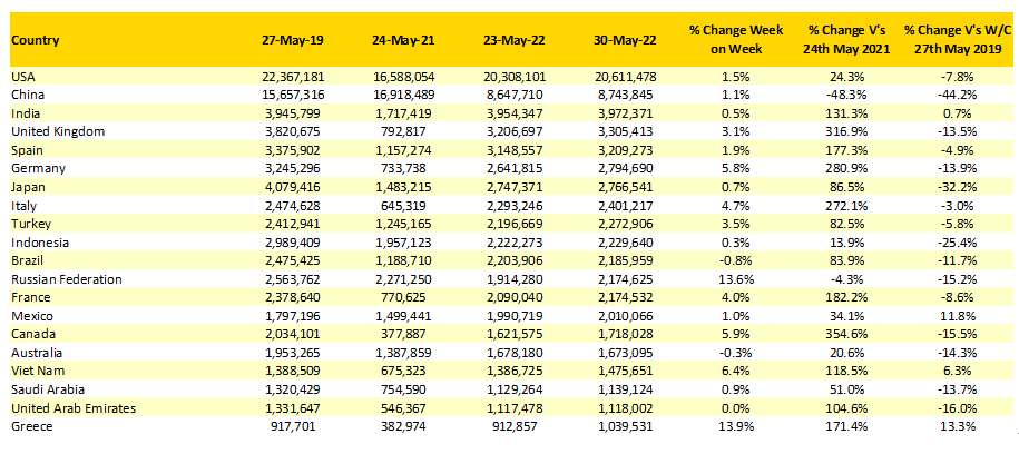 同比增長最快的是希臘,也正(zhèng)因此,希臘(là)本周才得以躋身Top 20之(zhī)列,將哥倫比亞擠出排行(háng)榜。本周希臘運力環比增長13.9%,比疫情之前的水平(píng)高出13.3%。這對於希臘及其烏佐酒生產(chǎn)商而言是好事,因為這(zhè)意味(wèi)著有更多的遊客將(jiāng)到訪希臘,哪怕機場要排起長龍。