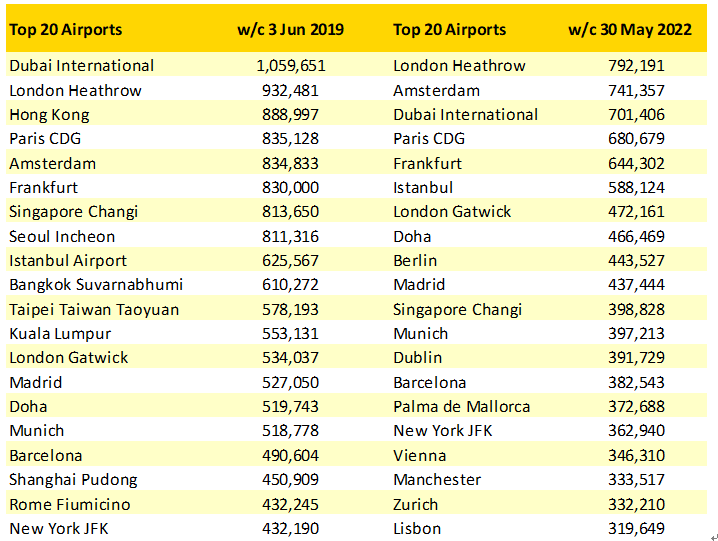 隨著西歐市場繼續(xù)強勢複蘇,國(guó)際機場(chǎng)的排行(háng)榜也變(biàn)得頗具看點。目(mù)前全球Top 20的國際機場排行榜仍然由(yóu)歐洲樞紐機場壟斷,西歐機場占(zhàn)據了16個席位。而(ér)值得關(guān)注的榜單缺(quē)席者包括有中國香港及(jí)台北、韓國仁川、泰國曼穀、馬來西(xī)亞吉隆(lóng)坡等機場,而(ér)新加坡機場已經回歸Top 20之列,排(pái)在第(dì)11名(míng),不過新加坡機場(chǎng)也(yě)隻是恢(huī)複了2019年同期一半的運(yùn)力。倫敦希思羅機場本周拔(bá)得頭籌(chóu),阿姆斯(sī)特丹緊(jǐn)隨其後。
