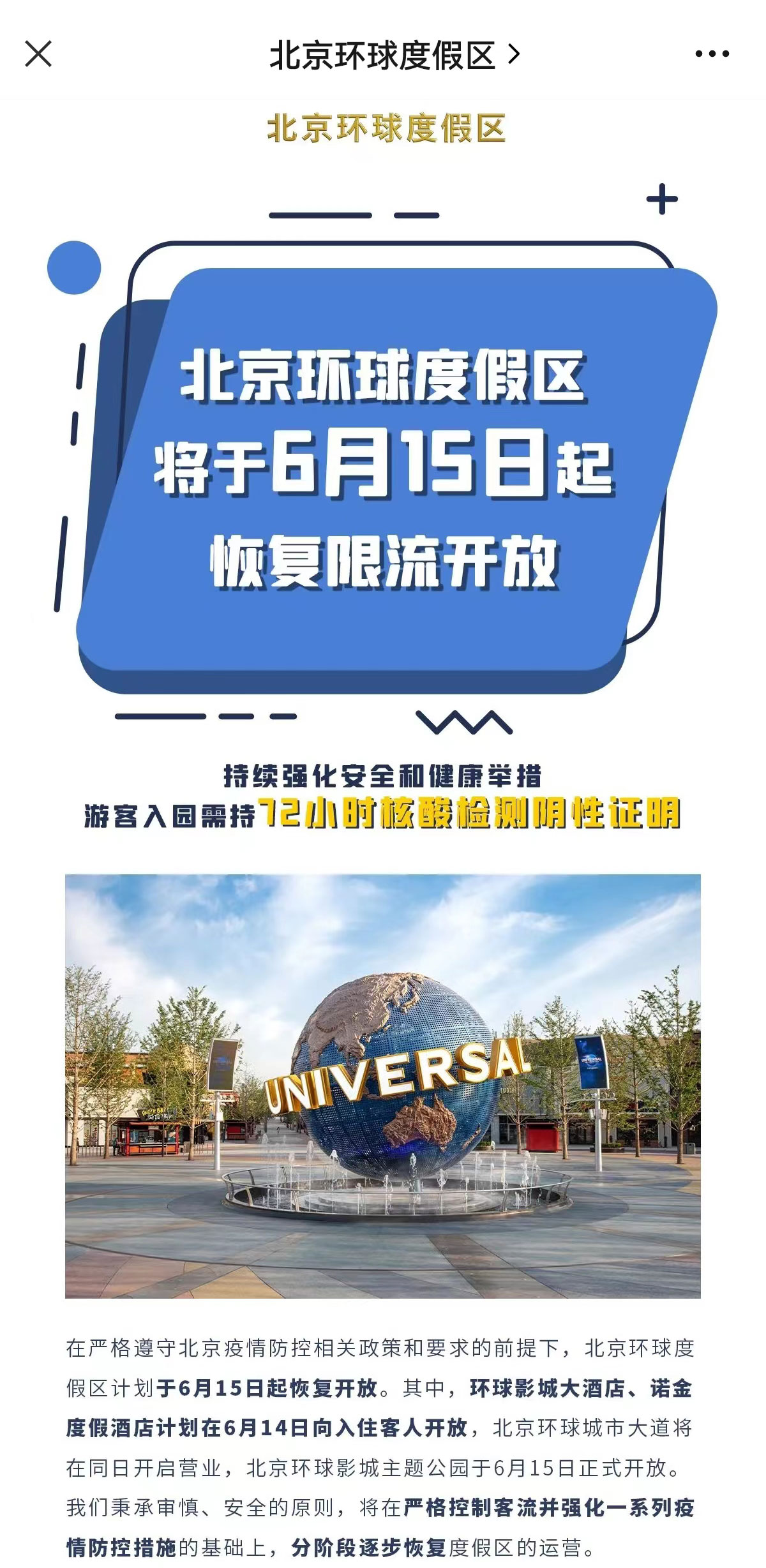 北京(jīng)環球度假區將於6月15日起按照每日75%的限流比例恢複開放。