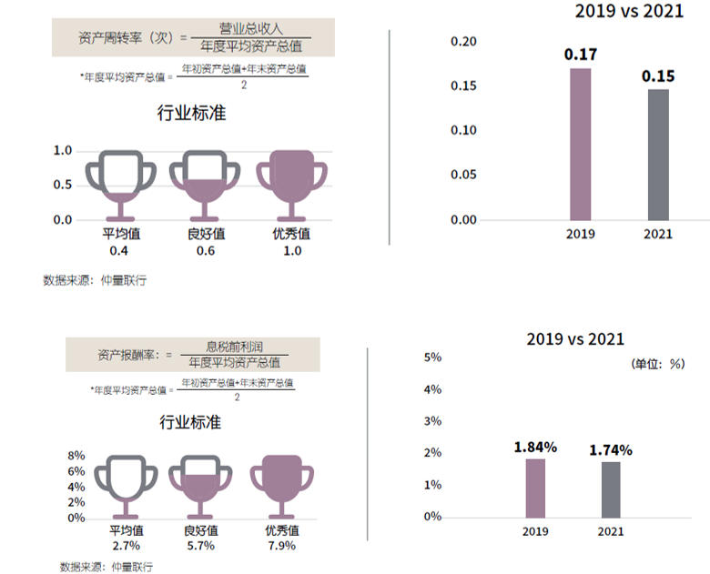 本次(cì)調研結果顯示(shì)出,受疫情(qíng)影響,多項數據指標均出現下滑。其中反映酒店(diàn)運營管理和資(zī)產管理水平(píng)的資產(chǎn)周(zhōu)轉率和資產報酬率,在2021年均低於國資委考核分配局(jú)編製的《企業績效評價標準值》中記載的住宿和(hé)餐飲業全行業的平均值。