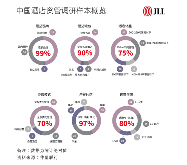 本次調查針對近百位酒店業主進行了問卷調查,獲得了大量(liàng)、豐富、時間跨度涵蓋疫情前後(2019年和2021年)的13項重要的酒店運營指標和資產管理指標。參(cān)與調查的酒店遍(biàn)布全國各(gè)主要區域,大部分為規模在200至400個房間,提供全服務的國際或國內連鎖品牌酒店,其中70%為全權委(wěi)托(tuō)管理,自營和第三方管理各占17%,特許經營占5%,可(kě)以說(shuō)是一次對中(zhōng)國酒店行業資產管理(lǐ)水平的全景描(miáo)摹。