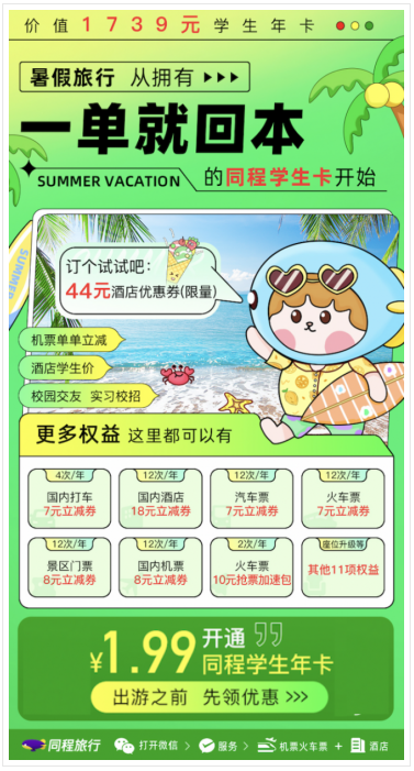 從(cóng)即日起(qǐ)至8月14日,中(zhōng)國內地在校生隻需要登錄同程旅行微信小程序,進入“涼爽到心巴的夏天”主題頁麵,進入同程學生卡(kǎ)頁麵,進行(háng)學生認證並支付(fù)1.99元,即可領取價值1739元的同程學(xué)生卡(kǎ)權益。此次1.99元同程學生卡不(bú)僅涵蓋了12張18元國內酒店立減券、7元火車票(piào)立減券、8元景區立減券、8元國內(nèi)機票立(lì)減券,還擁有國(guó)內打車、火車搶票加速(sù)包等額外13項權益(yì),券包優惠力度覆蓋全年。