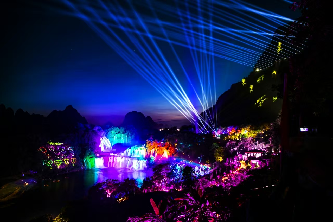 景區傾力打造亞(yà)洲首個沉浸式(shì)跨國夜遊互動體驗項目--“奇妙・夜德天”,遊客可從高空棧道俯瞰德天瀑布夜景,欣賞璀璨燈光下瀑布的(de)磅礴氣勢,也能近距離感受燈光與水幕的完美交融,獲得身臨其境的體驗,實現“一(yī)夜德天,一瀑兩國”的沉浸式體驗。